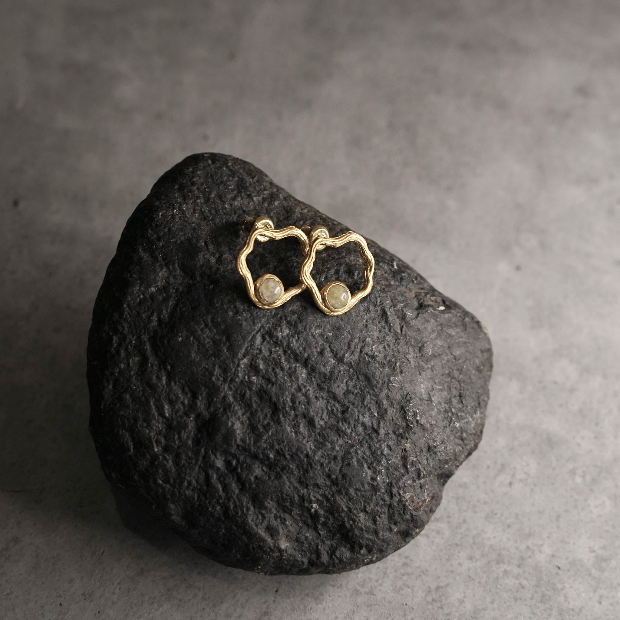 Wavy textured circles in delicate, flowing forms cradle a single bog stone at the base, capturing the serene movement of tides. Minimalist yet striking, these earrings embody effortless unique style and the refined beauty of natural forms.