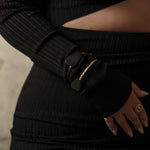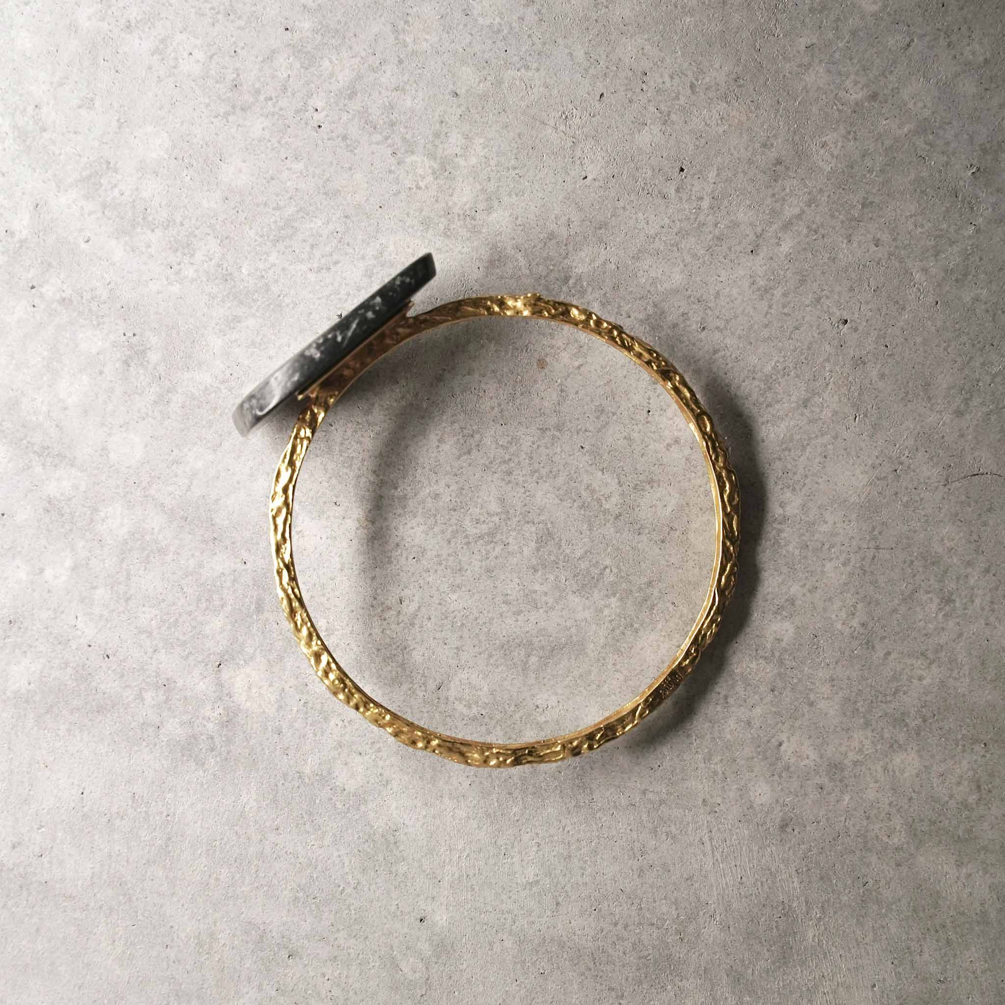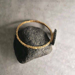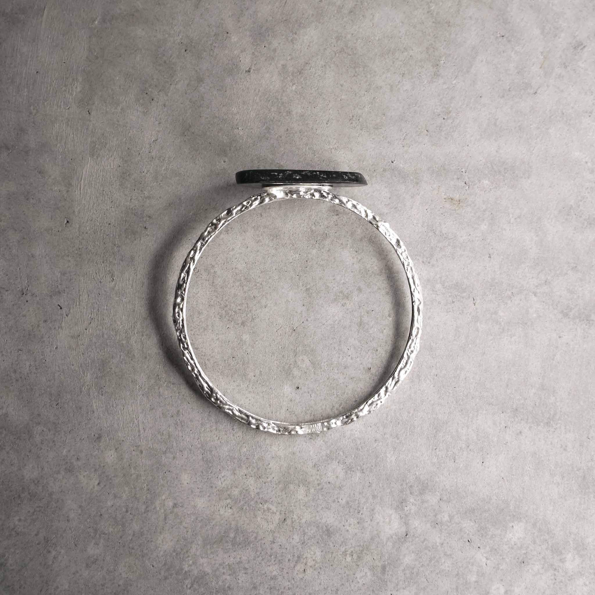 A tribute to feminine strength and nature’s harmony, this wavy bangle holds a minimal bog stone like a crown atop gentle waves. Minimalist yet striking, it embodies the serene power and fluid elegance of the sea.