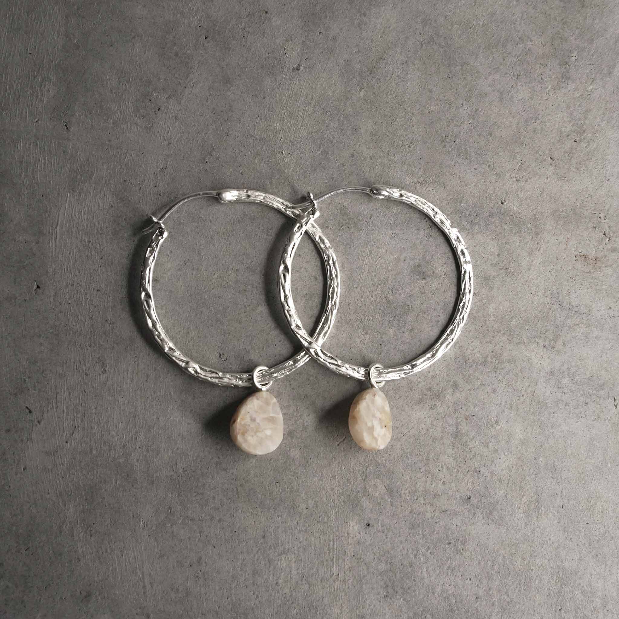 Crafted with a heavily organic surface, the Earthgrain Hoops are a tribute to nature’s raw textures — from tree bark to ancient rock. The removable bog-stone pendant adds weight, meaning, and grounding energy. Hand-crafted sustainably, these hoops bring the outdoors into everyday elegance.