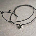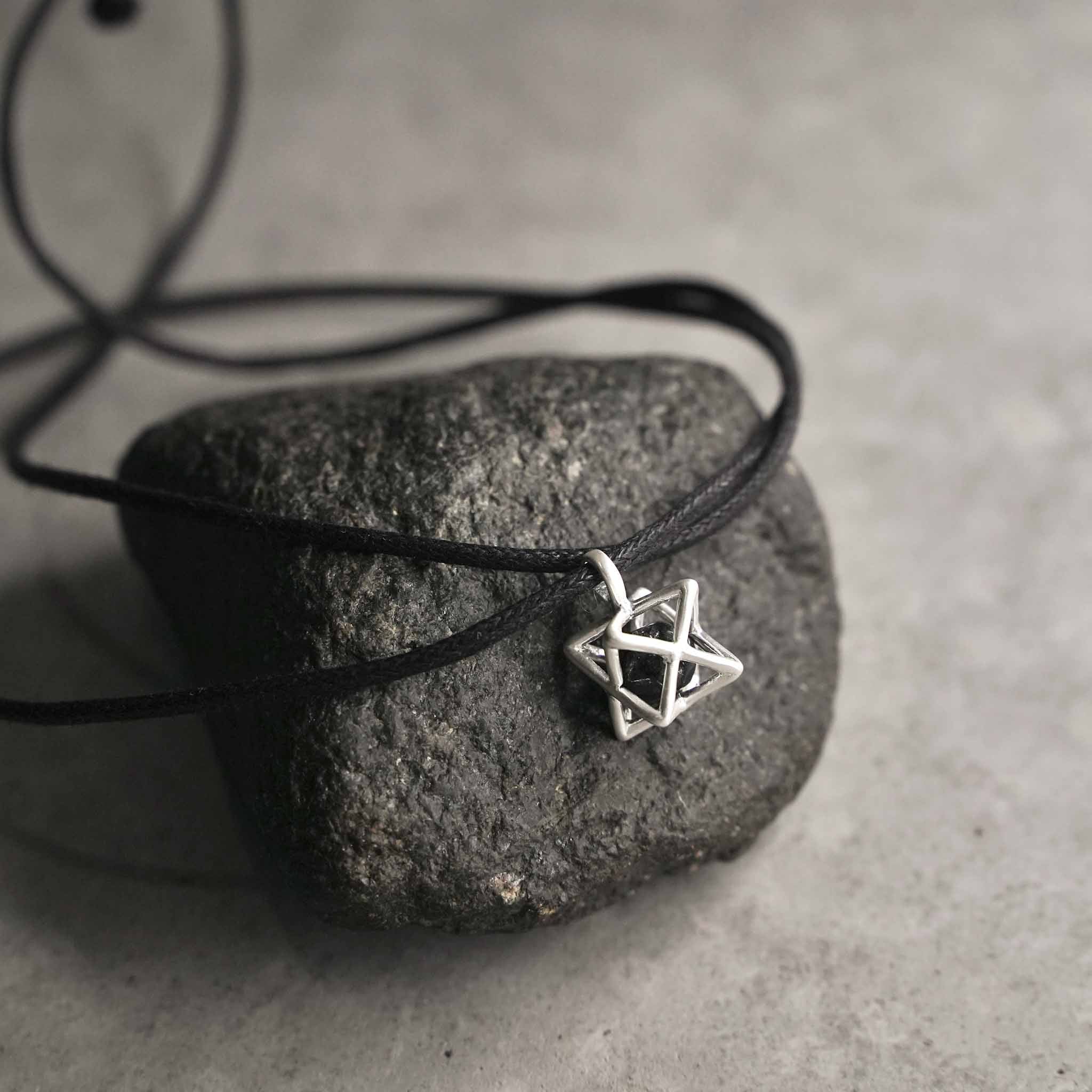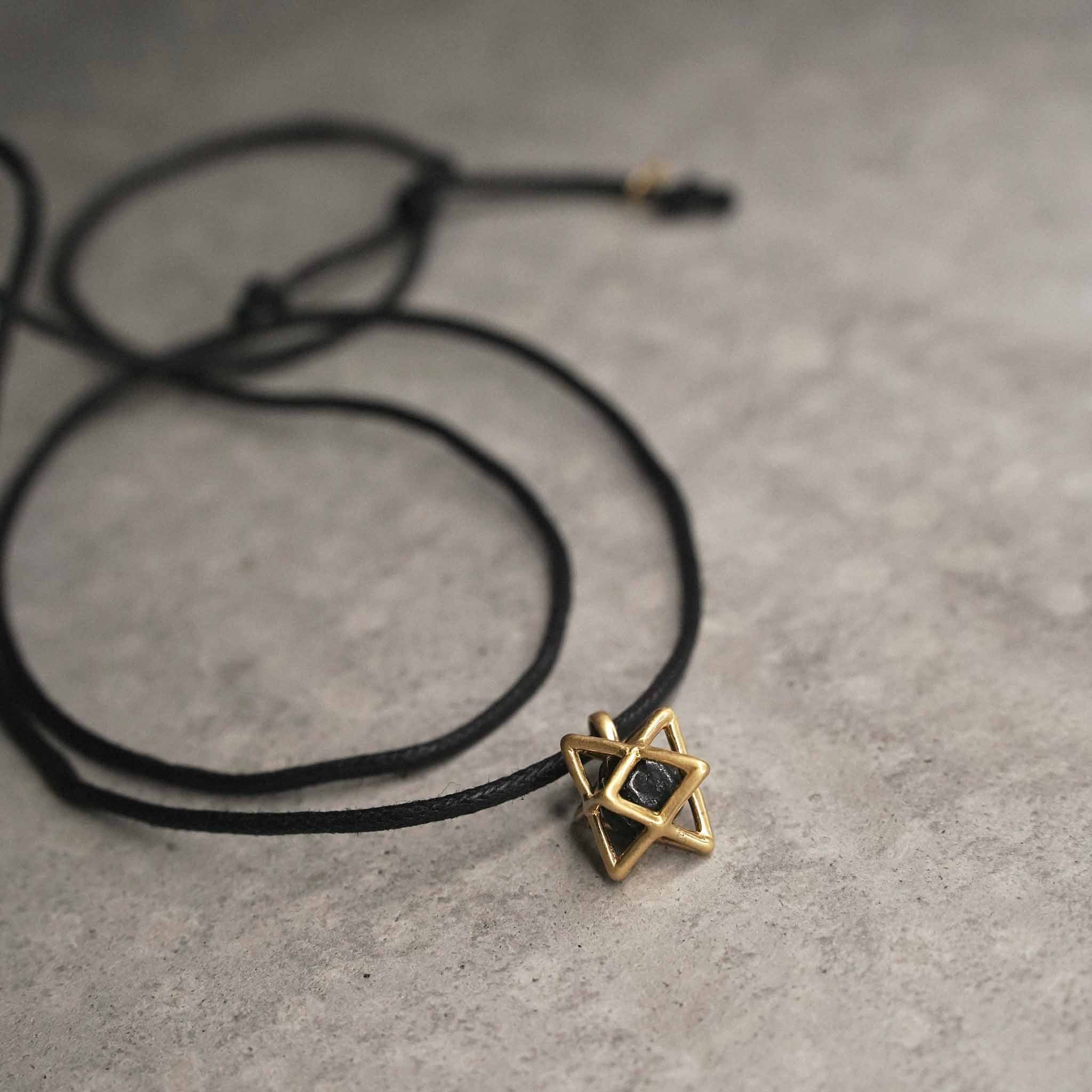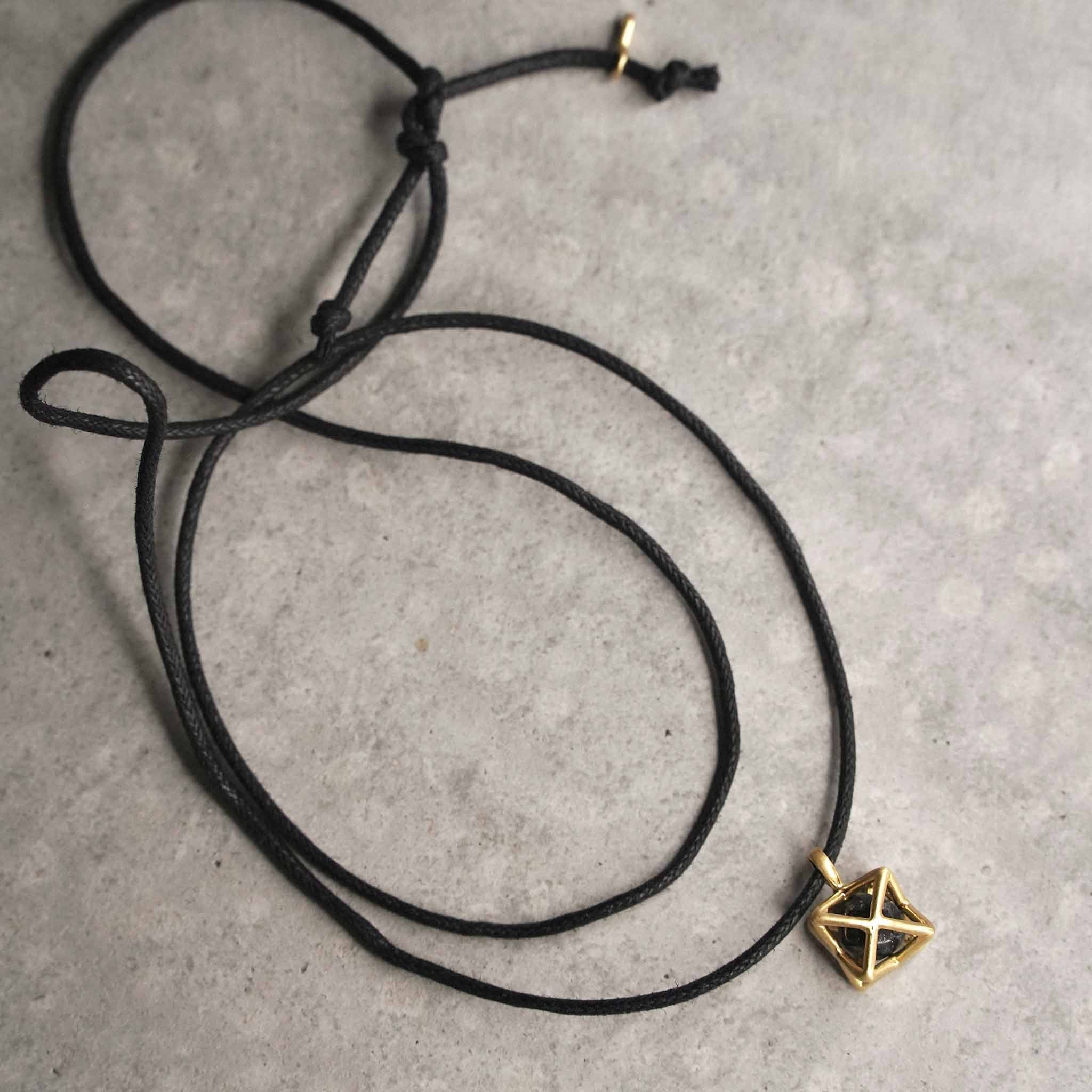 The Apex Pendant features two geometric triangles forming a double pyramid. The pendant is strung on a waxed organic cotton cord, giving it an earthy character. The freely suspended bog stone moves naturally with every gesture, combining raw texture with geometric elegance.
