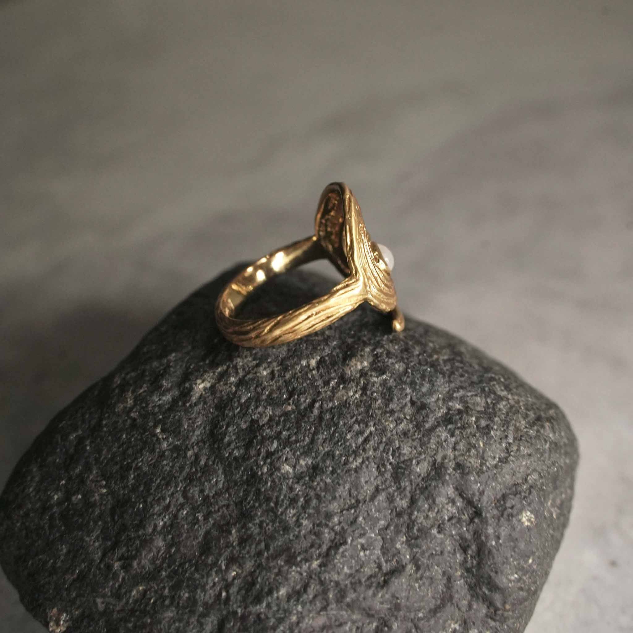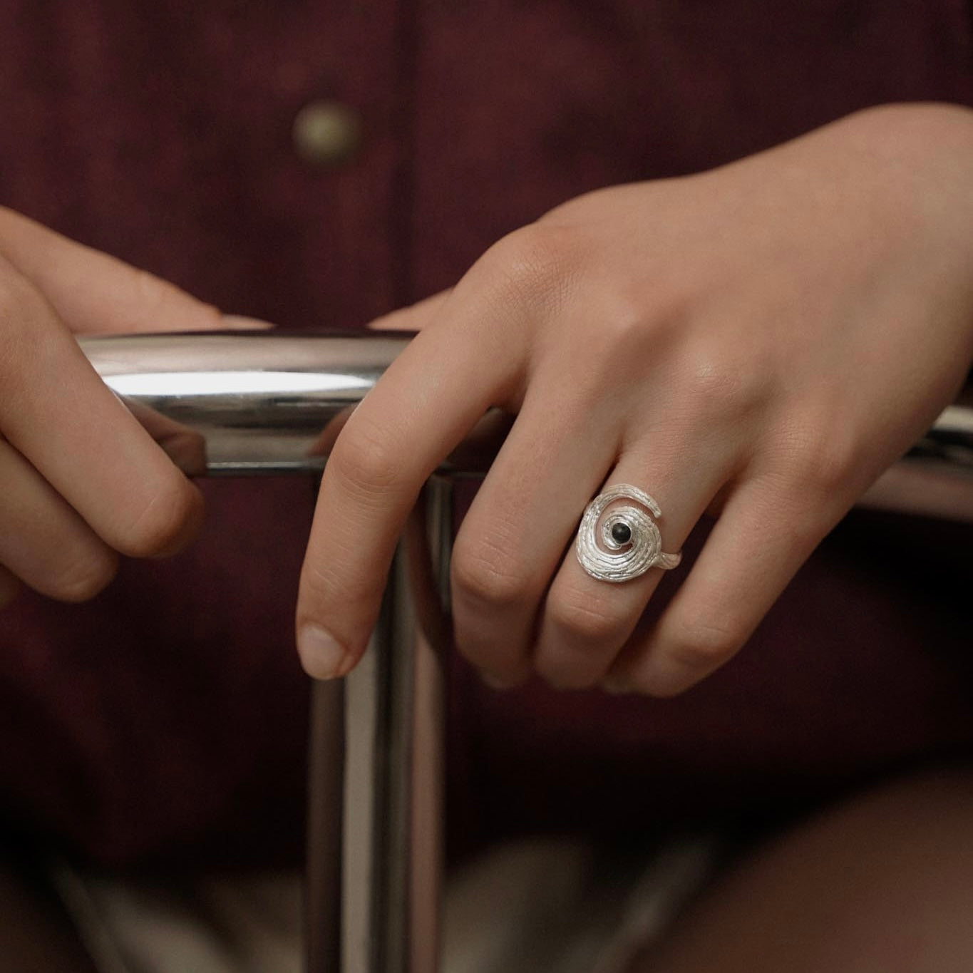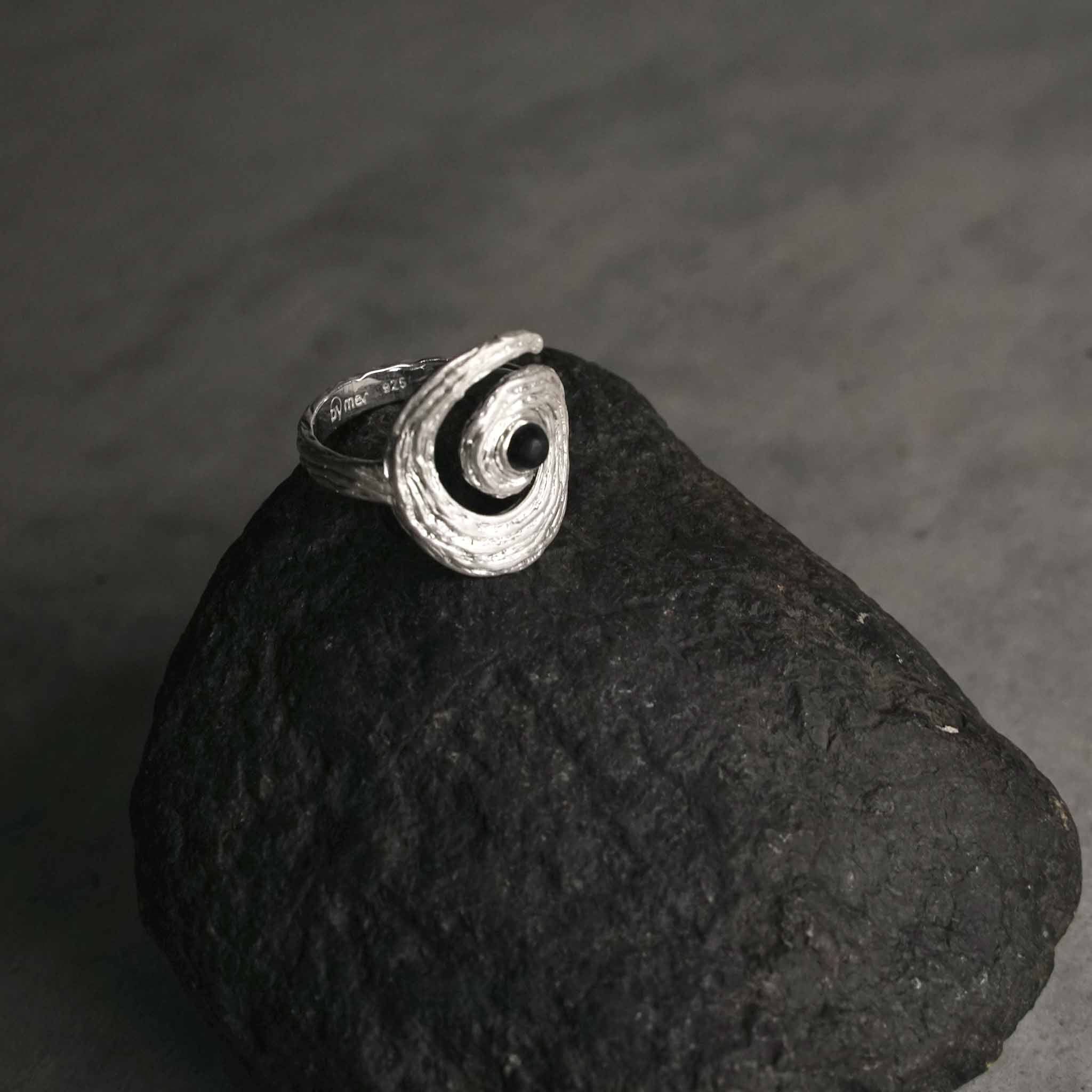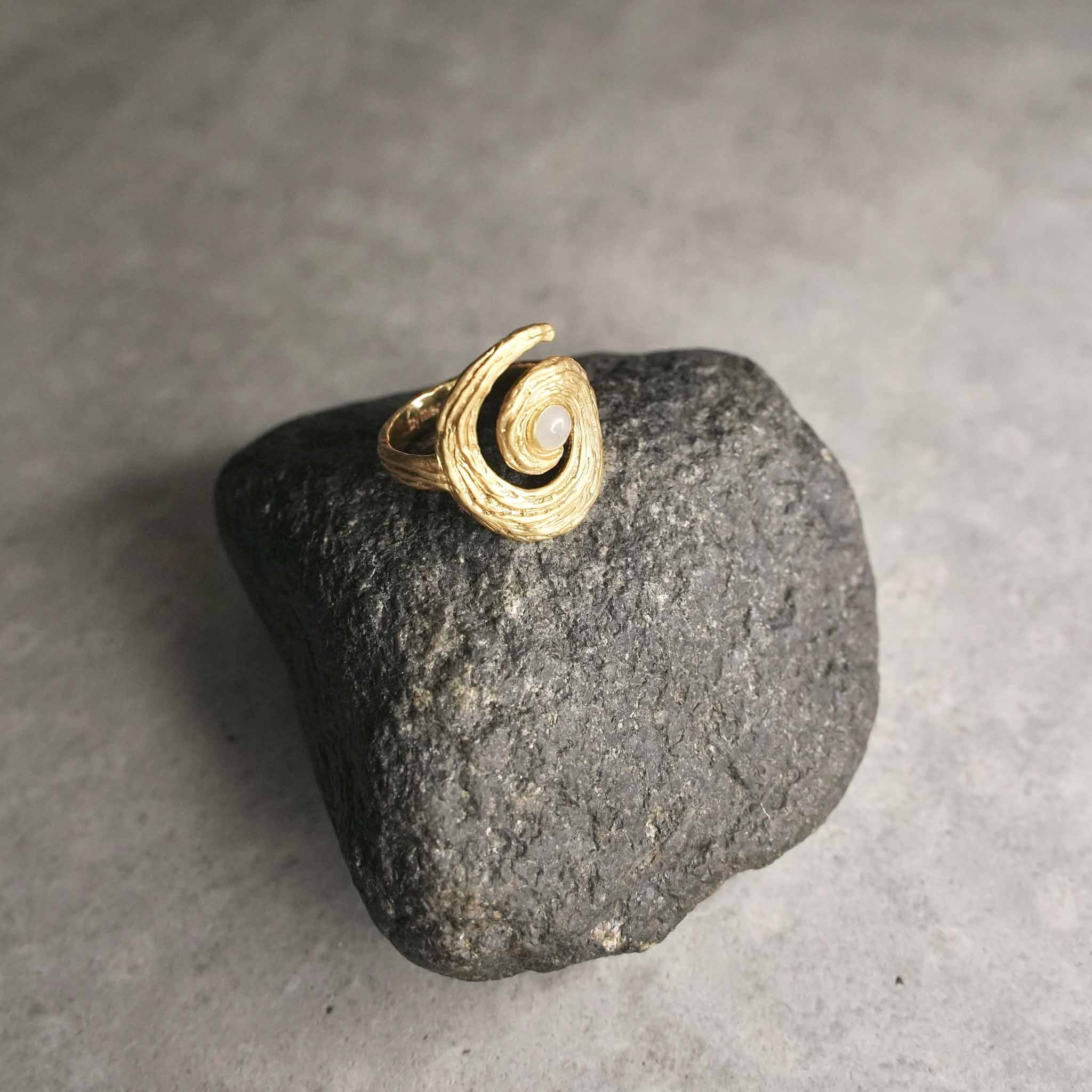 The elegant ring carries the quiet poetry of a moment in nature — that instant when your fingertips touch a still pond and gentle circles begin to drift outward. Its spiral form captures that soft expanding motion, while at the center it cradles a small bog stone in a delicate embrace, like a treasure gathered from the earth and held with intention.