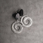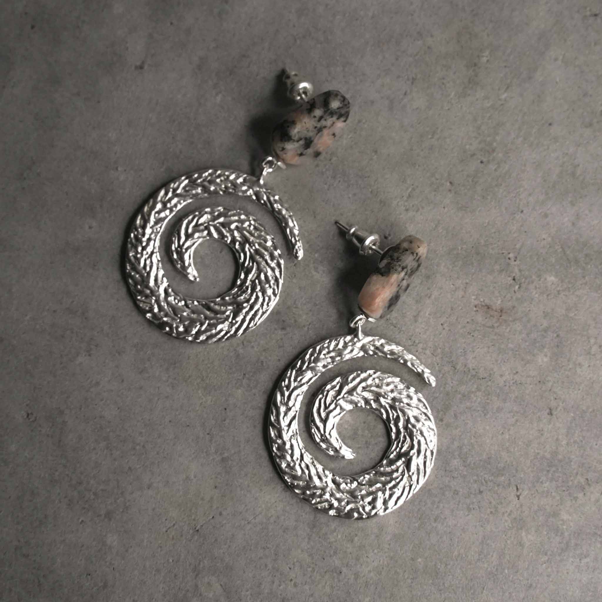 These elegant Ripple Twirl Swing earrings capture the poetry of a quiet moment in nature. A bog stone hangs freely from the twirl, moving with every gesture like a pebble carried by gentle waves. Minimal, organic, and effortlessly luxurious - a whisper of the seaside for your ears.